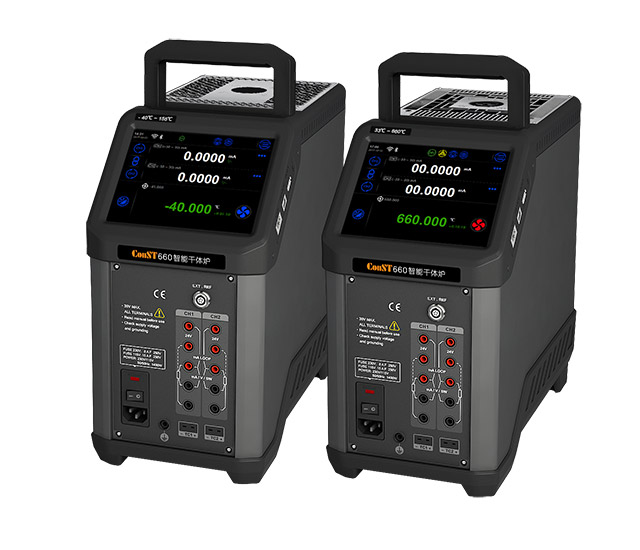康斯特公司在2017年進行了干體式溫度校準器的技術研發,推出了最新一代智能溫度校準設備。ConST660應用多項創新技術,具有升降溫速度快、抗干擾能力強、環境適應性好,控溫區間寬,溫場均勻性好等特點,采用全觸屏操作,伸縮式提手設計,支持外置標準RTD控溫方式,同時具備兩個被檢通道。ConST660的出現有望改變了國外產品在我國一枝獨秀的銷售局面。