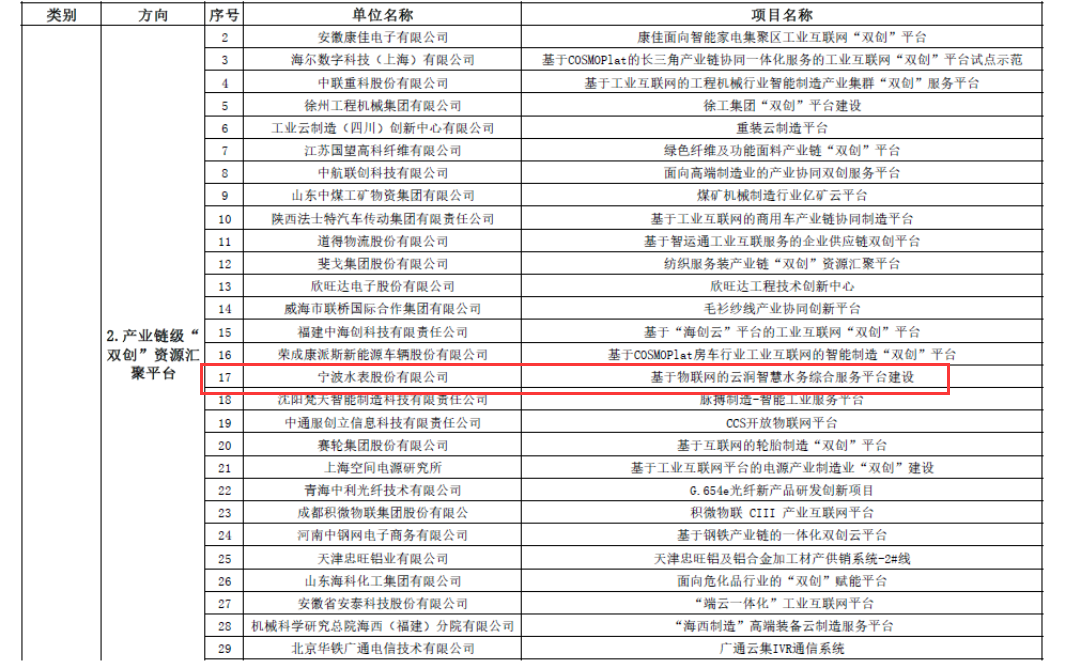 近日,國家工信部公示了2019年制造業“雙創”平臺試點示范項目名單,經企業自主申報、地方推薦和專家評審,寧波水表股份有限公司的“基于物聯網的云潤智慧水務綜合服務平臺建設”被評為產業鏈級“雙創”資源匯聚平臺方向的試點示范項目,成為此次國內唯一一家面向智慧水務領域的示范試點項目。