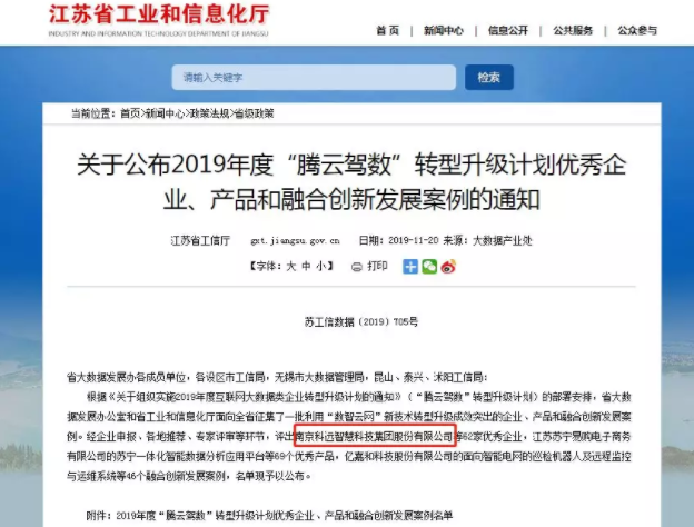 日前,江蘇省信息化領導小組大數據發展辦公室和江蘇省工業和信息化廳聯合公布了2019年軟件企業轉型升級計劃(“騰云駕數”轉型升級計劃)優秀企業、產品和融合創新發展案例,南京科遠智慧科技集團股份有限公司入選優秀企業第一位。