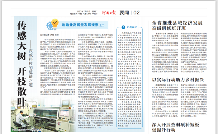 7月7日,《河南日報》要聞版大篇幅報道點贊漢威科技集團,刊出《傳感大樹,開枝散葉——漢威科技的延鏈之道》報道,評價漢威已形成了獨具特色的“以傳感器為核心,智能儀器儀表為支柱,行業(yè)應用為導向”的完整產(chǎn)業(yè)鏈,牢牢掌握住了物聯(lián)網(wǎng)產(chǎn)業(yè)鏈的“微笑曲線”的兩端。