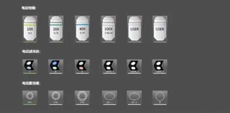 NCF950 提供多種電動運動部件,包括:電動平臺、電動調(diào)焦、電動物鏡轉(zhuǎn)盤、電動熒光轉(zhuǎn)盤、電動聚光鏡和電動調(diào)光,操作方式同時兼容按鈕操作和軟件操作,并且提供調(diào)用命令,方便用戶自行控制和開發(fā)。