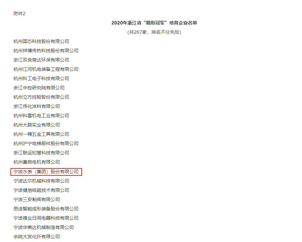 2021年1月13日,浙江省經(jīng)濟和信息化廳公布“浙江省隱形冠軍”企業(yè),寧水集團成功入選培育名單。