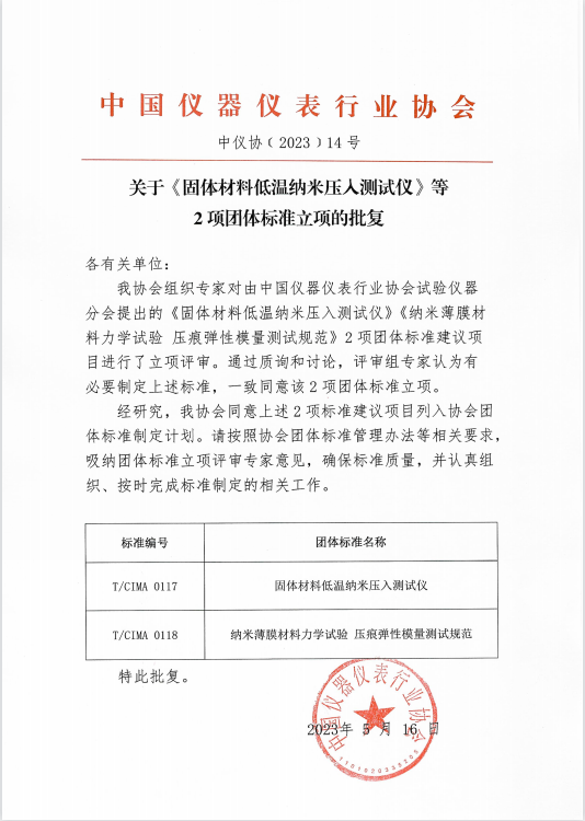 我協(xié)會組織專家對由中國儀器儀表行業(yè)協(xié)會試驗儀器分會提出的《固體材料低溫納米壓入測試儀》《納米薄膜材料力學試驗 壓痕彈性模量測試規(guī)范》2項團體標準建議項目進行了立項評審。通過質(zhì)詢和討論,評審組專家認為有必要制定上述標準,一致同意該2項團體標準立項。