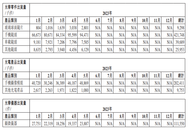 近日,舜宇光學科技公布2023年5月各主要產(chǎn)品出貨量。