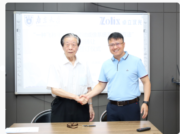 2023年6月15日,卓立漢光集團董磊副總經(jīng)理帶領(lǐng)研發(fā)團隊拜訪南京大學陳洪淵院士團隊,在南京大學仙林校區(qū)化學樓隆重舉行了“一種飛秒干涉散射顯微成像系統(tǒng)及測量方法”專利轉(zhuǎn)讓的簽約儀式。