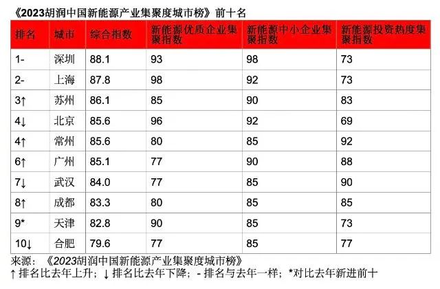 6月19日發(fā)布的《2023胡潤(rùn)中國(guó)新能源產(chǎn)業(yè)集聚度城市榜》(以下簡(jiǎn)稱榜單)顯示,深圳、上海、蘇州位列前三,北京、常州則并列第四,廣州、武漢、成都、天津和合肥分列6-10位。