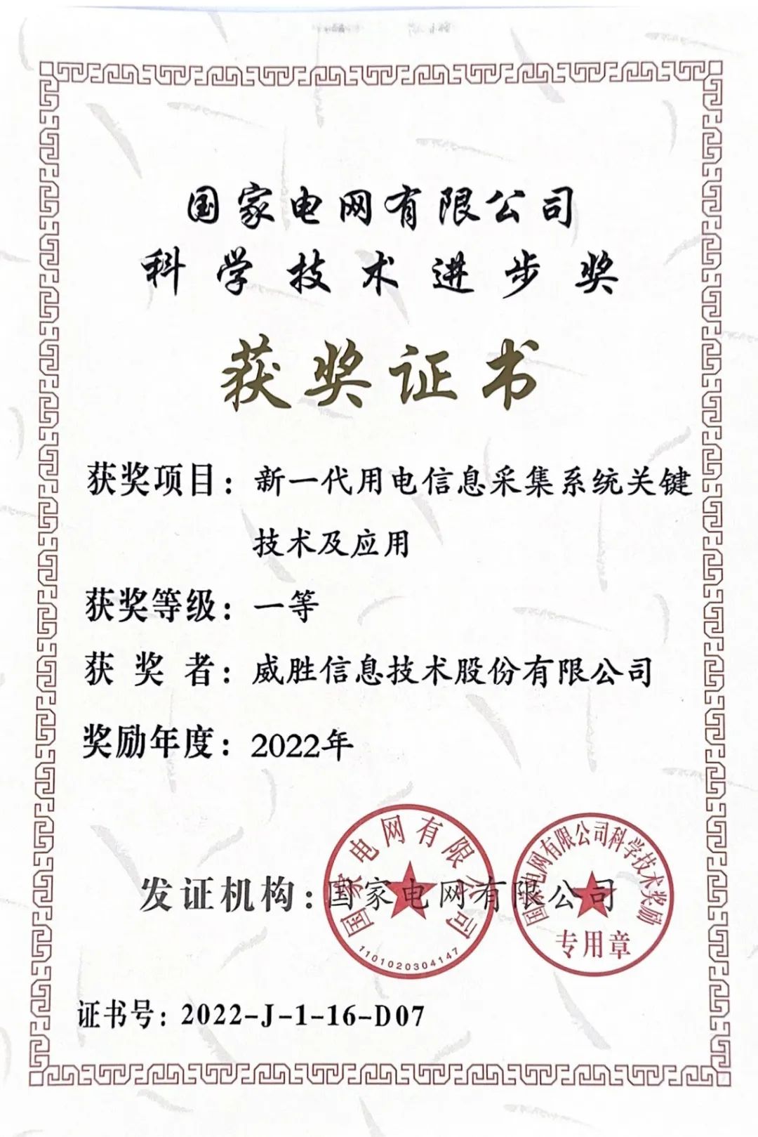 近日,威勝信息參與的“新一代用電信息采集系統(tǒng)關(guān)鍵技術(shù)及應(yīng)用”項目獲得國家電網(wǎng)有限公司2022年度科學(xué)技術(shù)進步一等獎。