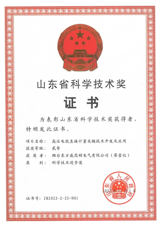 6月20日上午,中共山東省委、省人民政府在濟(jì)南召開(kāi)全省科技創(chuàng)新大會(huì),對(duì)2022年度獲得山東省科學(xué)技術(shù)獎(jiǎng)的獲獎(jiǎng)項(xiàng)目進(jìn)行表彰。煙臺(tái)東方威思頓電氣有限公司完成的“高壓電能直接計(jì)量關(guān)鍵技術(shù)開(kāi)發(fā)及應(yīng)用”項(xiàng)目榮獲山東省科學(xué)技術(shù)進(jìn)步二等獎(jiǎng)。該項(xiàng)目成功研制出0.2S級(jí)直接接入式高壓智能電能表,解決了高壓電能無(wú)法直接計(jì)量的難題,顛覆了傳統(tǒng)高壓電能計(jì)量行業(yè),整體項(xiàng)目技術(shù)水平達(dá)到“國(guó)際領(lǐng)先”。