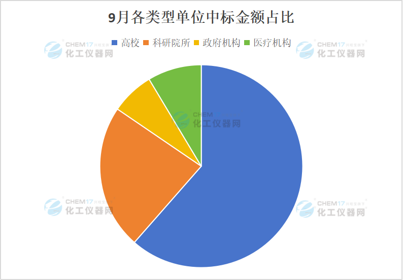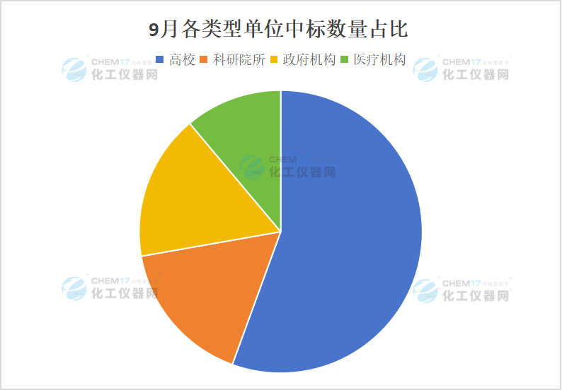據(jù)化工儀器網(wǎng)不完全統(tǒng)計,9月高校采購電鏡10套,采購金額為4305.26萬元,約占9月電鏡采購總金額的55.56%。從采購數(shù)量上看,科研院所和政府機構的采購數(shù)量均為3套,約占9月電鏡采購總數(shù)量的16.67%。