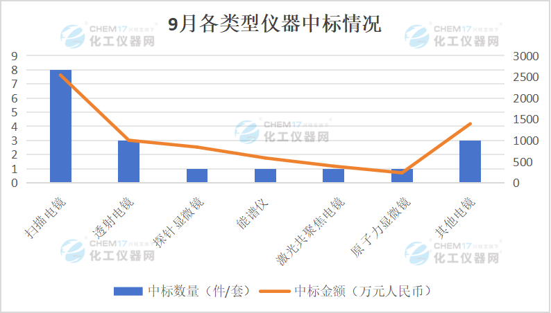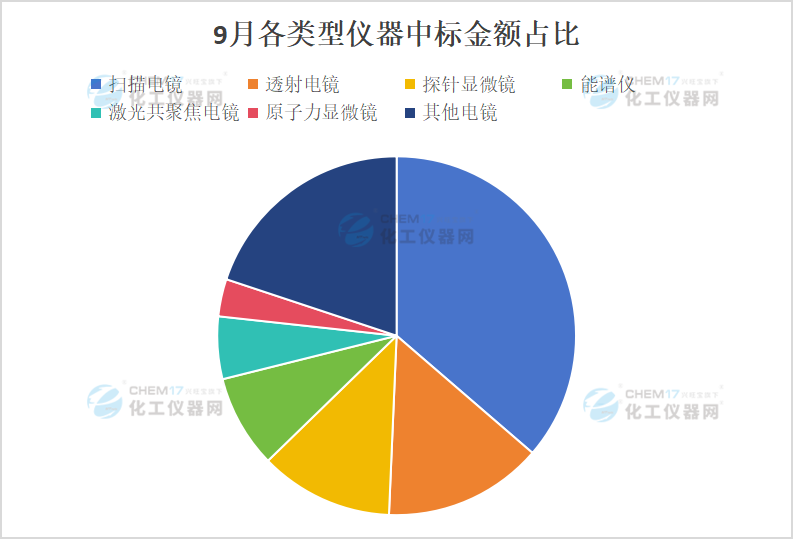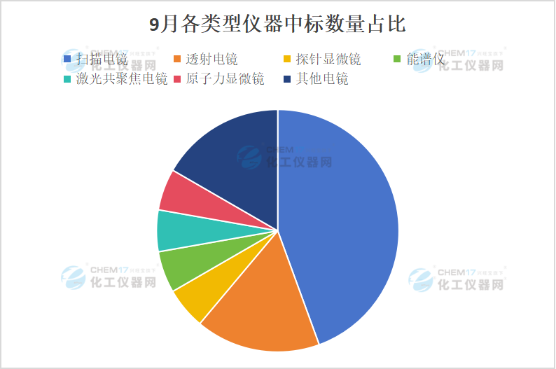 從“9月各類型儀器中標數(shù)量占比”和“9月各類型儀器中標金額占比”可以看出,掃描電鏡占據(jù)總中標數(shù)量的44.44%,占據(jù)總中標金額的36.32%;透射電鏡占據(jù)總中標數(shù)量的16.67%,占據(jù)總中標金額的14.35%。