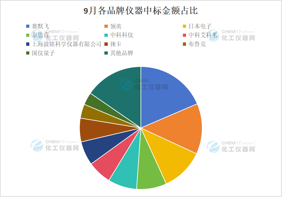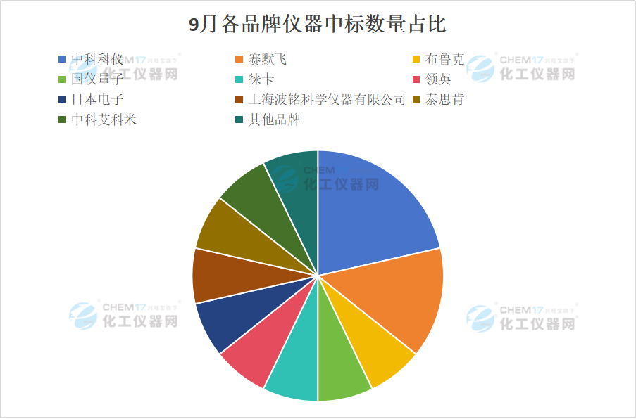 總體上看,9月電鏡中標數(shù)量與上月相比下降了5%,中標金額下降22.79%;高校是9月電鏡的采購主力,采購數(shù)量占比達55.56%,采購金額占比為36.33%;本月電鏡國產品牌中標數(shù)量和金額明顯提升,采購數(shù)量占比達33.33%,采購金額占比為16.72%,為今年以來最多;電鏡中標金額排名前5的品牌分別是賽默飛、領英、日本電子、泰思肯、中科科儀,中標金額分別為1174.52萬元、844萬元、716.43萬元、499.95萬元、482萬元。