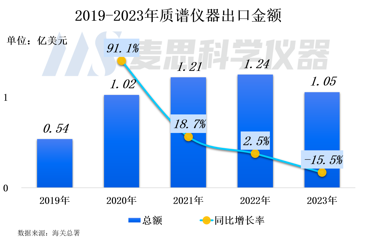 2023年我國質譜儀器出口金額達1.05億美元(約合人民幣7.35億元),同比下降15.5%。