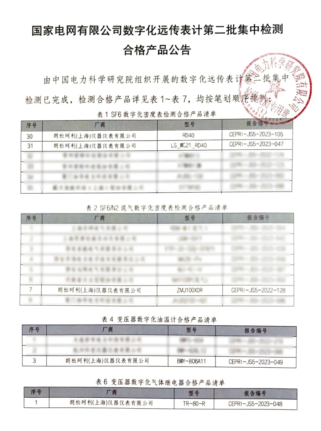 朗松珂利作為專業數字化遠傳表計生產廠家再次參與其中,并且多種數字化遠傳表計均一次性通過了統一檢測。此次送樣產品種類較多,覆蓋較廣,包含有線SF6數字化密度表、無線SF6數字化密度表、SF6/N2混合氣體數字化密度表、變壓器數字化油溫計和變壓器數字化氣體繼電器等。