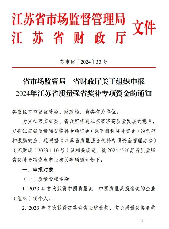 江蘇省市場監(jiān)管局、江蘇省財政廳發(fā)布關于組織申報2024年江蘇省質(zhì)量強省獎補專項資金的通知,申報對象包括2023年首次通過能源管理體系認證或節(jié)能產(chǎn)品認證或低碳產(chǎn)品認證或綠色產(chǎn)品認證,且經(jīng)省市場監(jiān)管局考核評估為優(yōu)秀的企業(yè)。詳情如下: