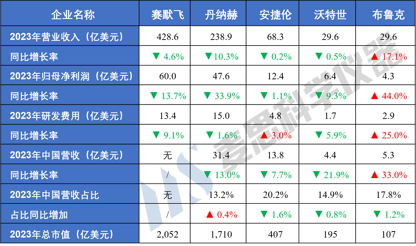 截至2024年2月,賽默飛、丹納赫、安捷倫、沃特世和布魯克已發布2023年年報。重點財務數據如下: