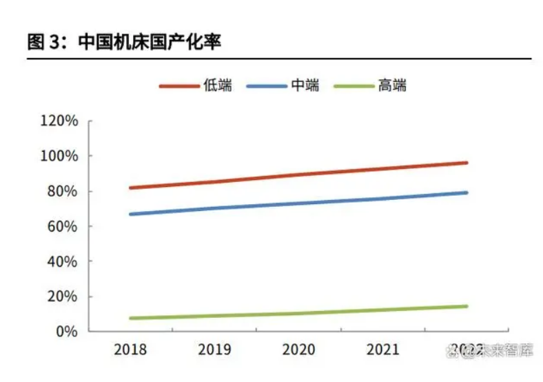 目前我國低端數控機床基本達到自給自足,中端數控機床基本實現國產替代,但 高端數控機床國產化率仍處于較低水平。根據科德數控公告,截至 2022 年底國內高端機床國產化率不足 10%。據中國機床工具工業協會數據,2023 年金屬切削機床數控化率為 45.5%。在發達國家中,日本機床數控化率維持在 80%以上,美國和德國機床數控化率均超 過 70%,與之相比國內機床數控化率提升空間較大。