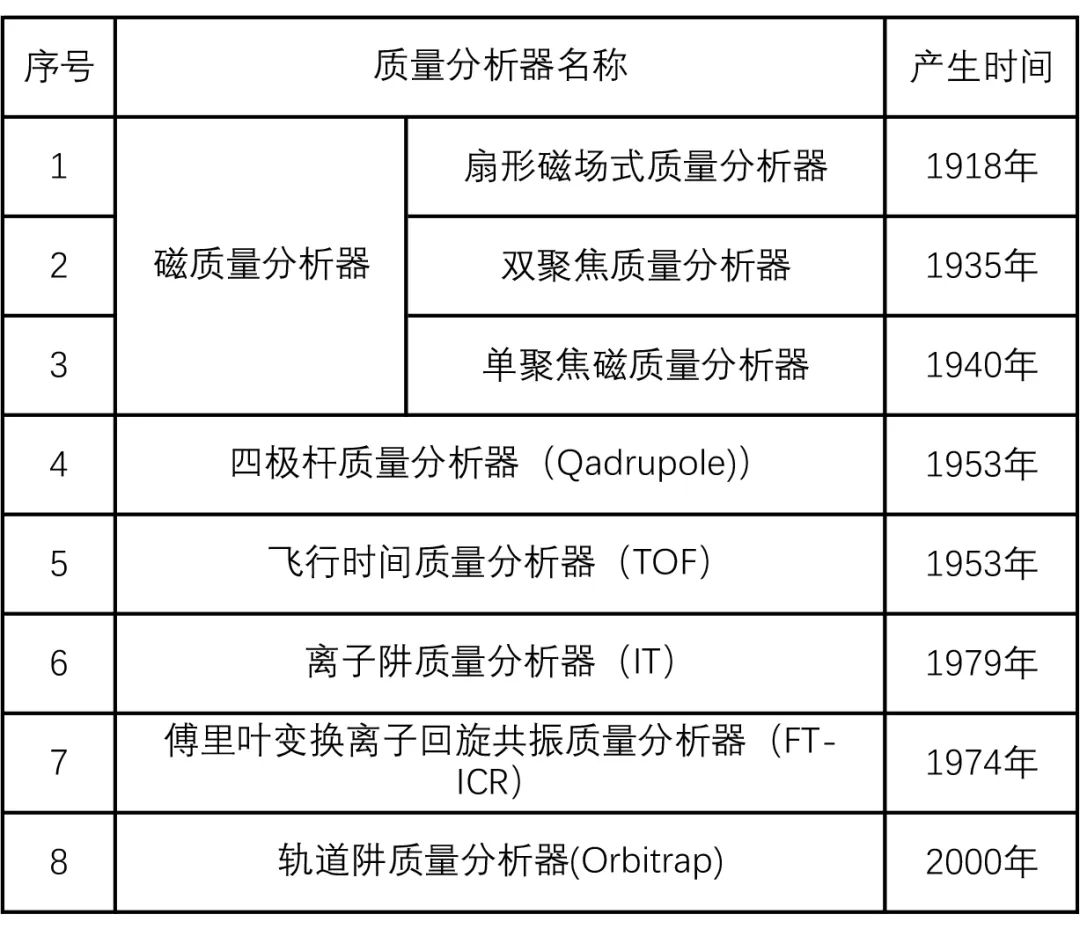 質(zhì)量分析器用于測量離子的質(zhì)量和電荷比(m/z),是質(zhì)譜儀器最為關(guān)鍵的組件。扇形磁場式質(zhì)量分析器于1918年問世。1953年,四極桿質(zhì)量分析器(Quadrupole)發(fā)明,并迅速成為廣泛應(yīng)用于各類質(zhì)譜儀的核心組件之一。飛行時間質(zhì)量分析器(TOF),使離子飛行時間成為測定質(zhì)量的有效手段,在高分辨率和高精確度的質(zhì)譜分析中扮演著重要角色。1974年,傅里葉變換離子回旋共振質(zhì)量分析器(FT-ICR)發(fā)明,質(zhì)譜分析達(dá)到了歷史最高的分辨率水平。1979年,離子阱裝置出現(xiàn),它具有捕獲、存儲和操控離子的能力。2000年,軌道阱質(zhì)量分析器(Orbitrap)技術(shù)問世,引領(lǐng)了質(zhì)譜儀器領(lǐng)域新的發(fā)展(表3)。