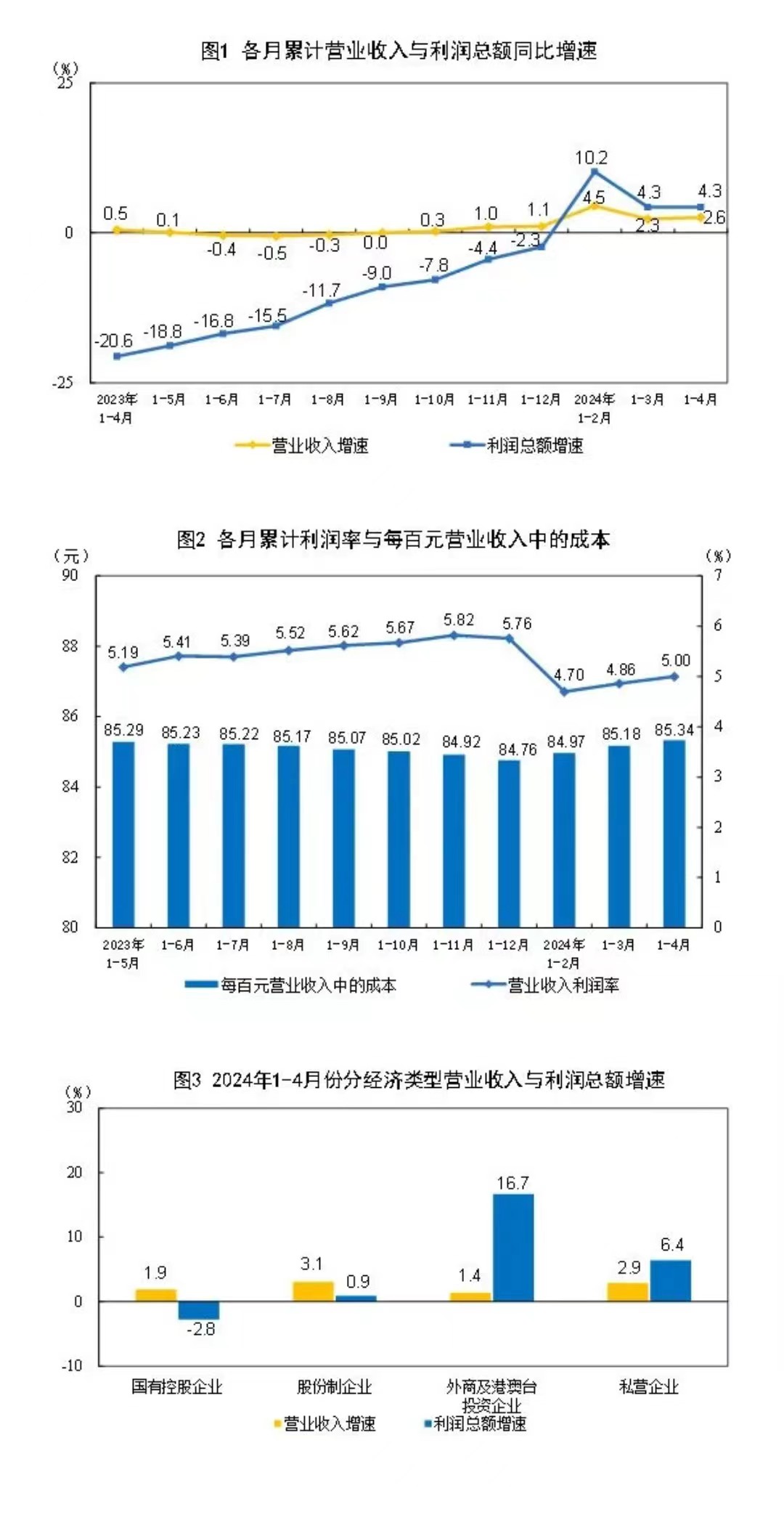 工業(yè)企業(yè)營(yíng)收增長(zhǎng)加快。隨著市場(chǎng)需求持續(xù)恢復(fù),工業(yè)生產(chǎn)增長(zhǎng)加快,產(chǎn)品出廠價(jià)格降幅收窄,產(chǎn)銷銜接水平提升,共同推動(dòng)企業(yè)營(yíng)收改善。1—4月份,規(guī)上工業(yè)企業(yè)營(yíng)業(yè)收入同比增長(zhǎng)2.6%,增速比1—3月份加快0.3個(gè)百分點(diǎn)。從當(dāng)月看,4月份規(guī)上工業(yè)企業(yè)營(yíng)業(yè)收入由3月份同比下降1.2%轉(zhuǎn)為增長(zhǎng)3.3%,增速回升4.5個(gè)百分點(diǎn),回升幅度較大,有力帶動(dòng)企業(yè)盈利改善。