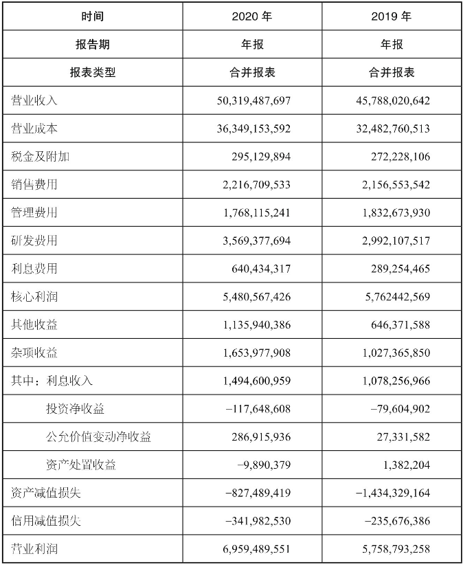 從表中可以看出:在2019年至2020年間,企業(yè)的營業(yè)利潤成長態(tài)勢明顯。企業(yè)的核心利潤牢牢占據(jù)營業(yè)利潤的主體,為支撐企業(yè)營業(yè)利潤的第一大主力;補貼收益占營業(yè)利潤的比重并不大,支撐企業(yè)雜項收益的主力軍是利息收入,其他雜項收益并不多。企業(yè)聚焦主業(yè)、主業(yè)具有較強盈利能力的色彩是比較明顯的。