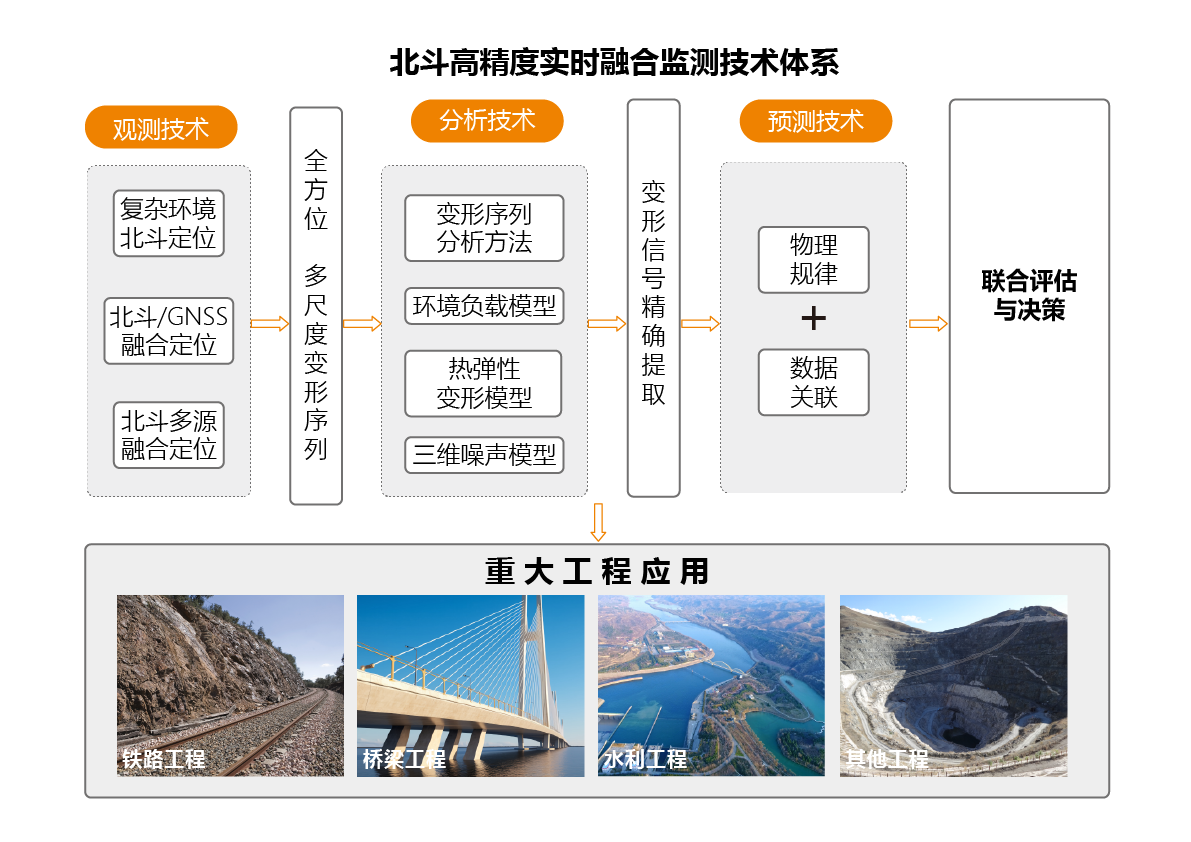 本項目面向基礎設施安全服役與智能運維建設的國家重大需求,在變形觀測、分析、評估和監(jiān)測平臺等多方面取得了突破性成果,形成自主創(chuàng)新的北斗高精度實時融合技術(shù)體系與監(jiān)測裝備,實現(xiàn)了集1毫米級、實時、自動、三維一體化變形監(jiān)測于一體的基礎設施安全監(jiān)測新模式。目前,項目成果已廣泛用于鐵路、橋梁、大壩等重大工程的安全監(jiān)測,顯著提升了我國大型基礎設施安全監(jiān)測和智能運維能力,推進了北斗智能融合技術(shù)的應用和發(fā)展。