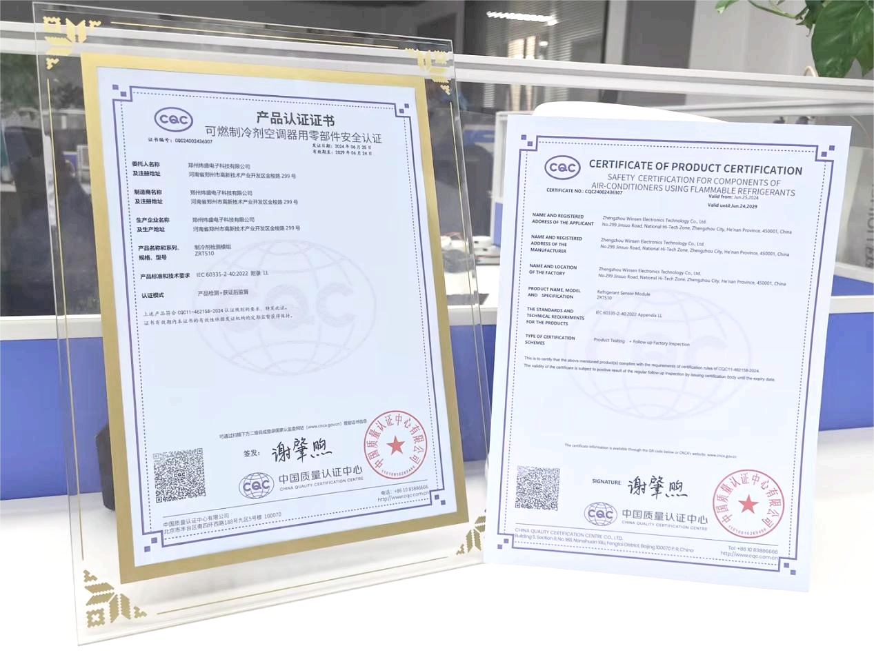 此前,ZRT510傳感器還通過了美標、歐標(UL/IEC 60335-2-40:2022)認證,獲得了2023年第7屆中國(國際)傳感器創新創業大賽企業組二等獎、中國室內健康舒適環境CCMSA-Wie Tec創新獎多項殊榮。