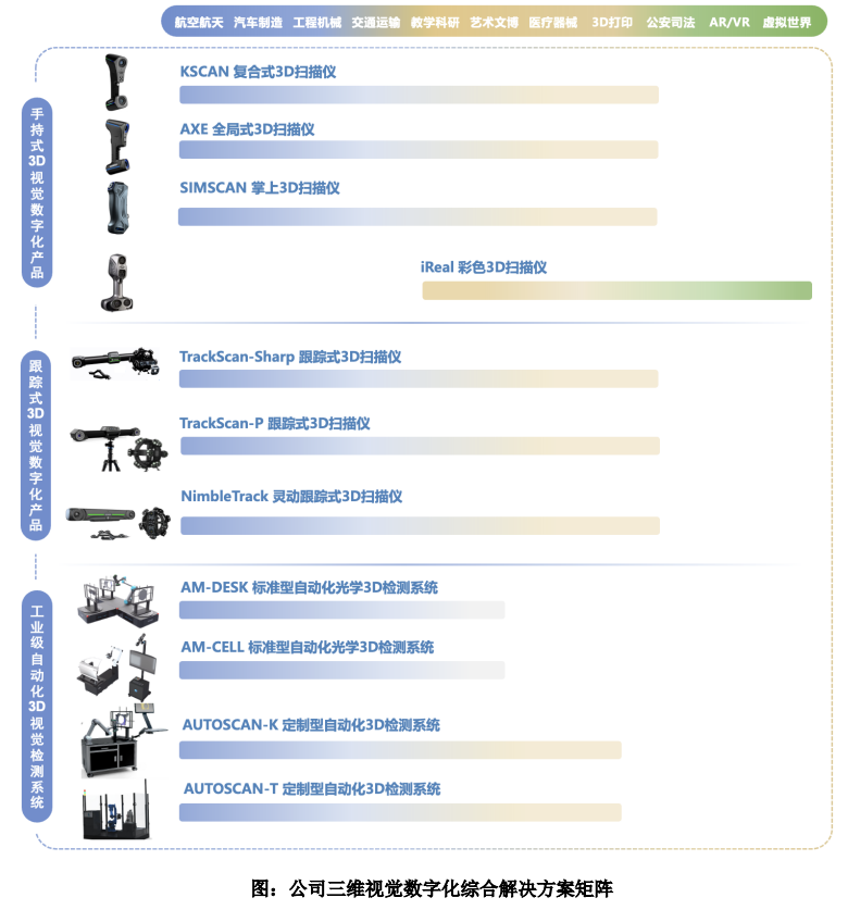 思看科技成立于2015年,公司控股股東和實(shí)際控制人均為王江峰、陳尚儉、鄭俊。公司是面向全球的三維視覺(jué)數(shù)字化綜合解決方案提供商,主營(yíng)業(yè)務(wù)為三維視覺(jué)數(shù)字化產(chǎn)品及系統(tǒng)的研發(fā)、生產(chǎn)和銷(xiāo)售。公司深耕三維視覺(jué)數(shù)字化軟硬件專(zhuān)業(yè)領(lǐng)域多年,逐步在關(guān)鍵光學(xué)部件、核心3D視覺(jué)算法、高性能硬件結(jié)構(gòu)設(shè)計(jì)、3D掃描及分析對(duì)比軟件等主要方面積累了豐富的技術(shù)能力,搭建起較為完善的三維視覺(jué)數(shù)字化技術(shù)平臺(tái),并基于此不斷開(kāi)發(fā)適應(yīng)領(lǐng)域廣泛、通用性強(qiáng)的創(chuàng)新產(chǎn)品。目前公司產(chǎn)品主要覆蓋工業(yè)級(jí)和專(zhuān)業(yè)級(jí)兩大差異化賽道,涵蓋便攜式3D視覺(jué)數(shù)字化產(chǎn)品、跟蹤式3D視覺(jué)數(shù)字化產(chǎn)品、專(zhuān)業(yè)級(jí)彩色3D視覺(jué)數(shù)字化產(chǎn)品和工業(yè)級(jí)自動(dòng)化3D視覺(jué)檢測(cè)系統(tǒng)等產(chǎn)品。