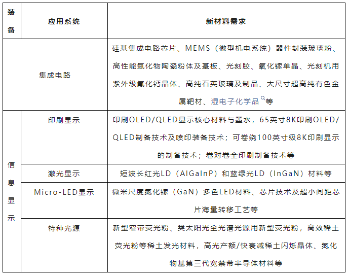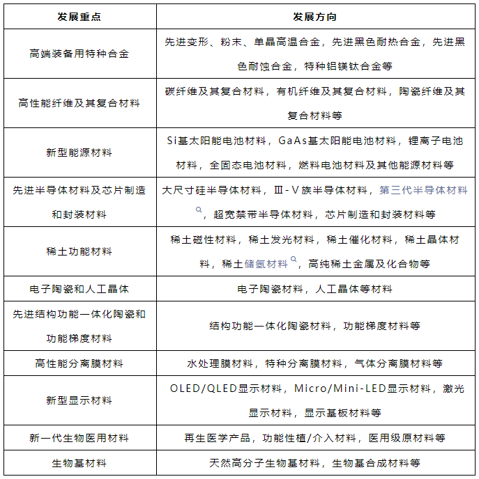 關(guān)鍵戰(zhàn)略材料領(lǐng)域發(fā)展重點(diǎn)及發(fā)展方向主要包括高端裝備用特種合金、高性能纖維及其復(fù)合材料、新型能源材料、先進(jìn)半導(dǎo)體材料及芯片制造和封裝 材料、稀土功能材料、電子陶瓷和人工晶體、先進(jìn)結(jié)構(gòu)功能一體化陶瓷和功能梯度材料、高性能分離膜材料、新型顯示材料、新一代生物醫(yī)用材料及生物基材料等(見表6)。