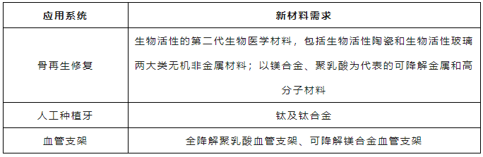 隨著全球人口老齡化日益加劇,人們對(duì)自身健康的關(guān)注度不斷提高,健康產(chǎn)業(yè)進(jìn)入加速發(fā)展時(shí)期。生物醫(yī)用材料的快速突破,將在疾病快速診斷、人體器官修復(fù)移植方面為人類帶來福祉,對(duì)國家的醫(yī)療安全、人民健康產(chǎn)生至關(guān)重要的影響,生命健康領(lǐng)域新材料需求見表4。