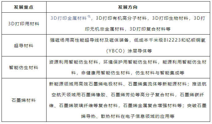 前沿新材料領(lǐng)域發(fā)展重點(diǎn)及發(fā)展方向主要包括3D打印用材料、超導(dǎo)材料、智能仿生材料、石墨烯材料等(見表7)。