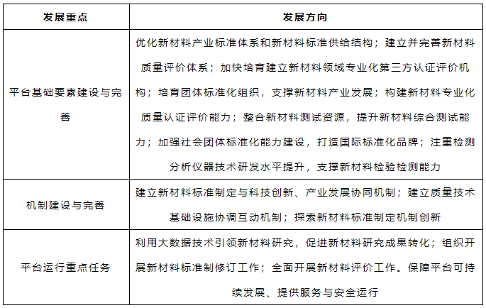 新材料評(píng)價(jià)、表征、標(biāo)準(zhǔn)平臺(tái)建設(shè)主要包括平臺(tái)基礎(chǔ)要素建設(shè)與完善、機(jī)制建設(shè)與完善、平臺(tái)運(yùn)行重點(diǎn)任務(wù)等重點(diǎn)發(fā)展方向(見表8)。