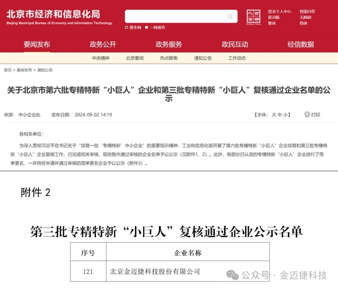 近日,國家工業和信息化部開展了第三批專精特新“小巨人”企業復核和第六批專精特新“小巨人”企業培育工作。金邁捷于2021年榮獲國家專精特新“小巨人”企業榮譽稱號,三年來憑借卓越的創新實力和穩健的發展態勢,成功通過復核,再次榮獲國家級專精特新“小巨人”企業稱號。