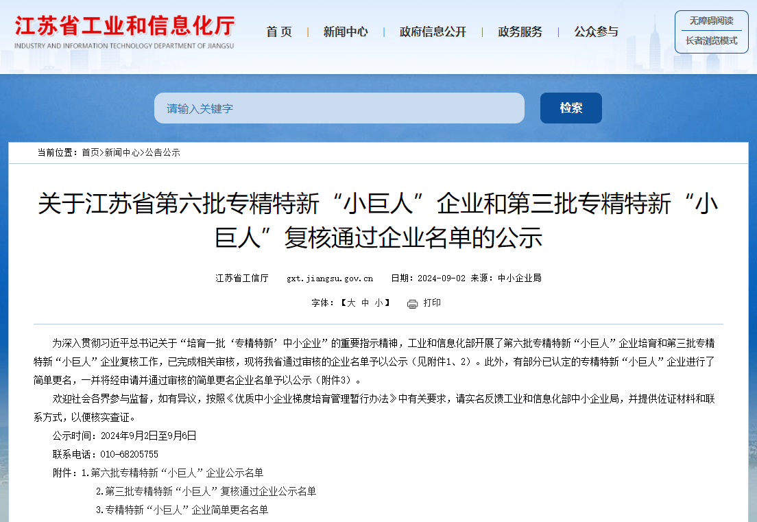 近日,江蘇省工業和信息化部公示了由國家工業和信息化部復核通過的第六批專精特新“小巨人”企業培育名單,其中蘇州貝茵科技股份有限公司成功上榜。
