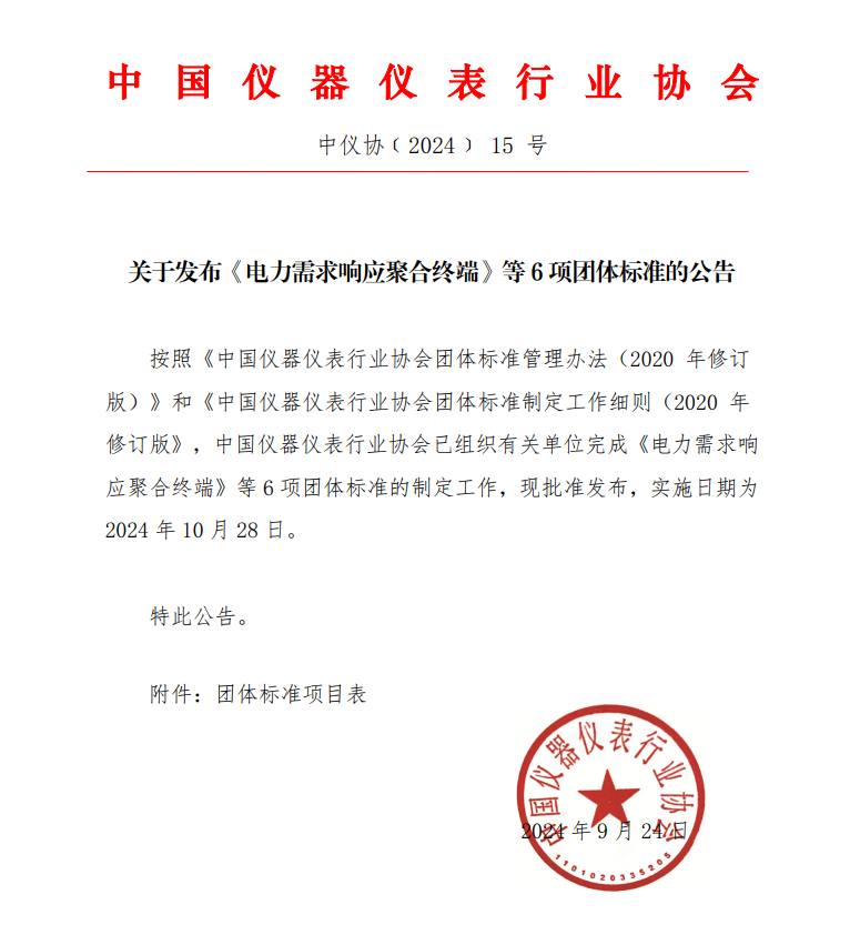 《電力需求響應聚合終端》等6項中國儀器儀表行業協會