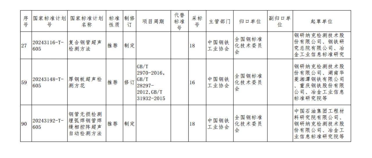 國(guó)家標(biāo)準(zhǔn)化管理委員會(huì)通知本次獲批推薦性國(guó)家標(biāo)準(zhǔn)計(jì)劃共計(jì)220項(xiàng),鋼研納克無(wú)損檢測(cè)專業(yè)牽頭起草標(biāo)準(zhǔn)2項(xiàng),參研1項(xiàng)(其中2項(xiàng)標(biāo)準(zhǔn)制定、1項(xiàng)標(biāo)準(zhǔn)修訂),見(jiàn)下表: