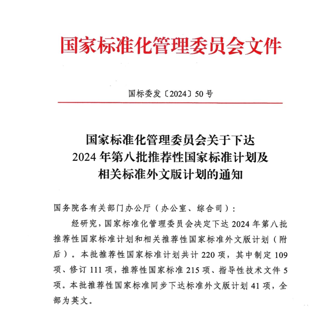 2024年10月26日,國(guó)家標(biāo)準(zhǔn)化管理委員會(huì)決定下達(dá)2024年第八批推薦性國(guó)家標(biāo)準(zhǔn)計(jì)劃和相關(guān)推薦性國(guó)家標(biāo)準(zhǔn)外文版計(jì)劃。