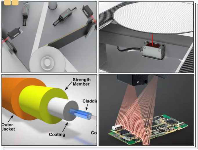 (左上)光伏行業(yè)卷繞糾偏 (左下)晶圓定位測(cè)量 (右上)光纖偏移測(cè)量 (右下)PCB質(zhì)量檢測(cè)