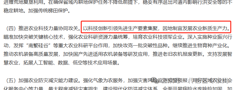 尤其值得關注的是,本次中央一號文件首次提出“農業新質生產力”概念,明確要推進農業科技力量協同攻關: