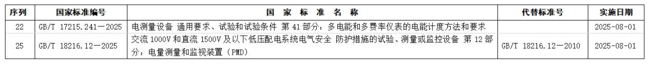 兩項標準分別為:GB/T 17215.241—2025《電測量設備 通用要求、試驗和試驗條件 第41部分:多電能和多費率儀表的電能計度方法和要求》、GB/T 18216.12—2025《交流1000V和直流1500V及以下低壓配電系統(tǒng)電氣安全 防護措施的試驗、測量或監(jiān)控設備 第12部分:電量測量和監(jiān)視裝置(PMD)》。