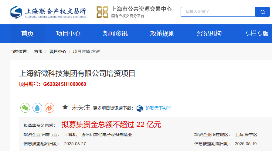 與此同時,維科網關注到,新微集團還在上海聯合產權交易所發布增資項目公告,擬募集資金總額不超過22億元,且本次公開掛牌增資已獲得其第一大股東上海聯和投資有限公司的批復。