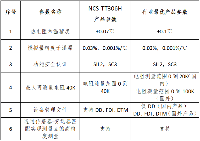 NCS-TT306H采用數(shù)字化技術(shù),內(nèi)置24bit高性能ADC,實現(xiàn)高可靠性、高測量精度和高長期穩(wěn)定性,滿足各種工業(yè)現(xiàn)場的測溫需求。真正雙通道設(shè)計,6端子的傳感器設(shè)計可滿足不同的雙輸入組合,可用于對冗余有要求的關(guān)鍵應用場合。符合IEC 61508功能安全標準的全面評估,安全等級達到了SIL2、SC3的要求。