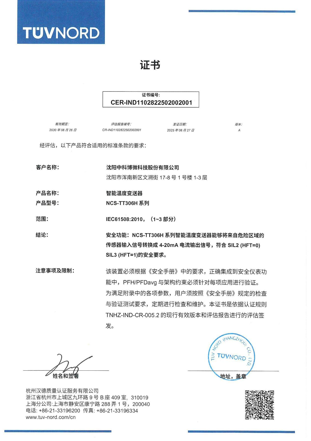 2025年8月27日,沈陽中科博微科技股份有限公司自主研發(fā)的NCS-TT306H智能溫度變送器通過TÜV測試,喜獲功能安全SIL認證權(quán)威證書。這標志著中科博微的科技創(chuàng)新能力及產(chǎn)品成果已達到國際先進、國內(nèi)領(lǐng)先水平,為更好的開拓市場奠定了堅實的基礎(chǔ)。