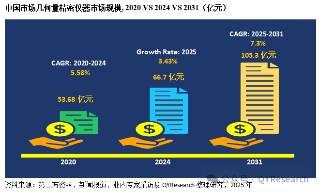 幾何量精密儀器是指用于測量物體長度、角度、形狀、位置、輪廓、形位誤差等幾何參數的高精度測量設備,是計量測試領域的基礎儀器之一,在工業生產、國家計量等領域具有重要作用。根據研究團隊調研統計,中國市場在過去幾年變化較快,2024年中國幾何量精密儀器市場銷售額達到了66.7億元,預計2031年將達到105.3億元,年復合增長率(CAGR)為7.3%2025-2031)。
