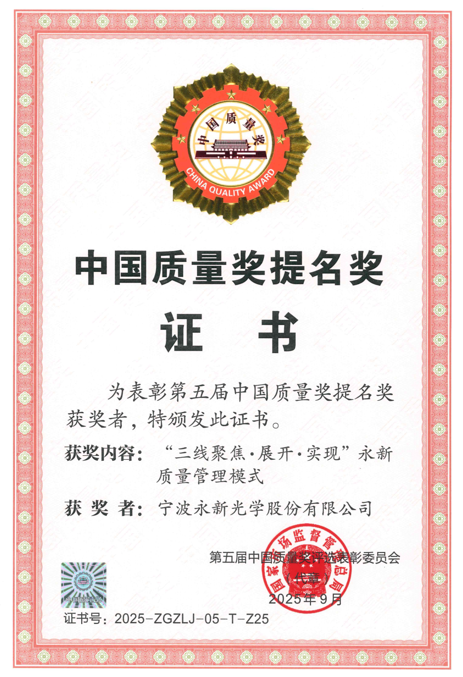 9 月 16 日,在南京舉行的中國質(zhì)量大會(huì)上,永新光學(xué)榮獲第五屆“中國質(zhì)量獎(jiǎng)提名獎(jiǎng)”。國務(wù)院副總理張國清出席開幕式并致辭,強(qiáng)調(diào)要深入貫徹習(xí)近平總書記重要指示精神,全面落實(shí)黨中央、國務(wù)院決策部署,深入實(shí)施質(zhì)量強(qiáng)國戰(zhàn)略,持續(xù)提升質(zhì)量治理效能,更好服務(wù)高質(zhì)量發(fā)展和人民群眾高品質(zhì)生活。此次獲獎(jiǎng),是永新光學(xué)繼2023年獲得第九屆浙江省人民政府質(zhì)量獎(jiǎng)之后,在質(zhì)量領(lǐng)域再獲的一項(xiàng)國家級(jí)重要榮譽(yù)。