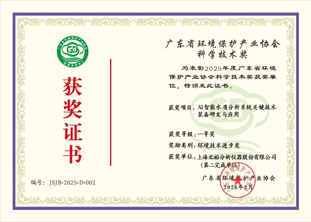 近日,上海北裕分析儀器股份有限公司在環保科技領域捷報頻傳,先后榮獲中國環境保護產業協會2025年度環境技術進步獎二等獎,與廣東省環境保護產業協會2025年度科學技術獎(環境技術進步獎)一等獎。兩項殊榮既是對北裕儀器創新成果的肯定,也充分體現了各方合作單位協同攻關、共同推動水環境監測技術進步的重要成效。