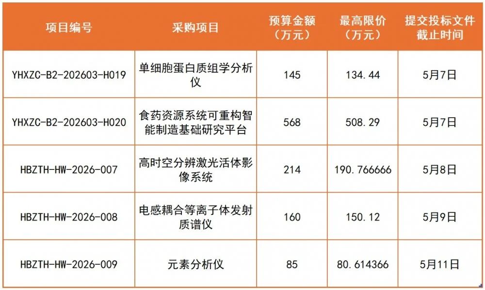 近日,武漢輕工大學生科院大型儀器設備平臺設備更新項目項目已正式啟動公開招標。本次采購涵蓋單細胞蛋白質(zhì)組學分析儀、食藥資源系統(tǒng)可重構(gòu)智能制造基礎研究平臺、高時空分辨激光活體影像系統(tǒng)、電感耦合等離子體發(fā)射質(zhì)譜儀及元素分析儀等多套高端科研設備,整體預算金額達1172萬元,項目最早投標截止時間為57日。